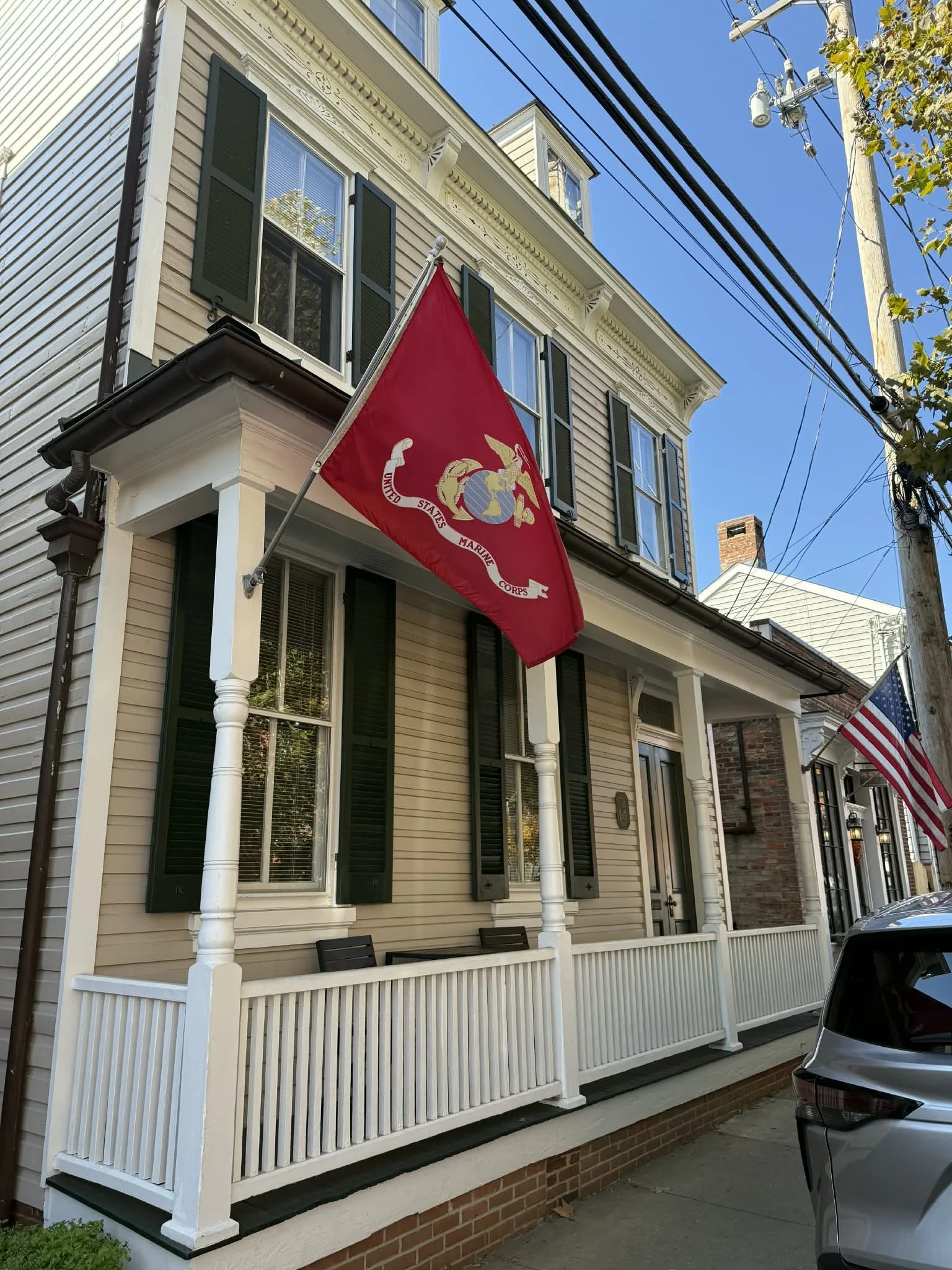 Front of a beige wooden house with black shutters, white porch railing, and two flags, one of the United States and one of the United States Marine Corps, hanging from the porch.